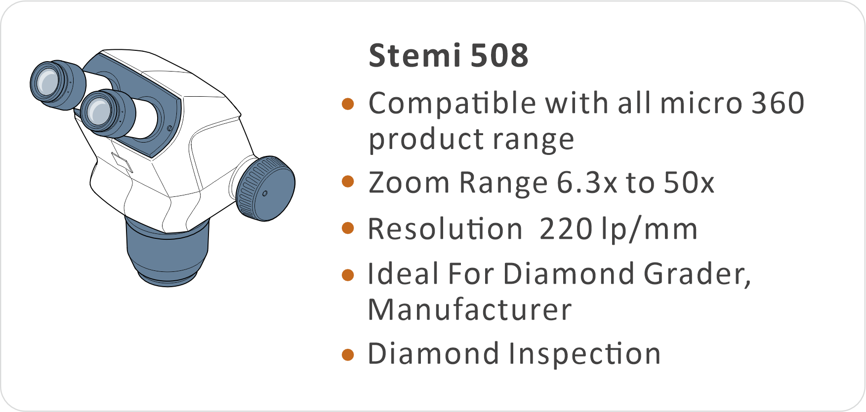 | Lens body | Stemi 305(binocular, incl.eyepieces 10x/23 Br. foc),Stemi 305 doc(Phototube, incl.eyepieces 10x/23 Br. foc) | Stemi 508(binocular, incl.eyepieces 10x/23 Br. foc),Stemi 508 doc(Phototube, incl.eyepieces 10x/23 Br. foc) | |||||||||||||||