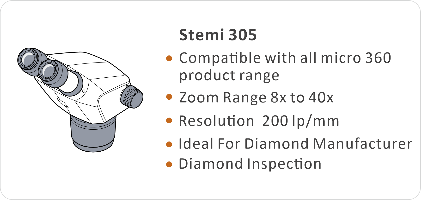 | Lens body | Stemi 305(binocular, incl.eyepieces 10x/23 Br. foc),Stemi 305 doc(Phototube, incl.eyepieces 10x/23 Br. foc) | ||||||||||