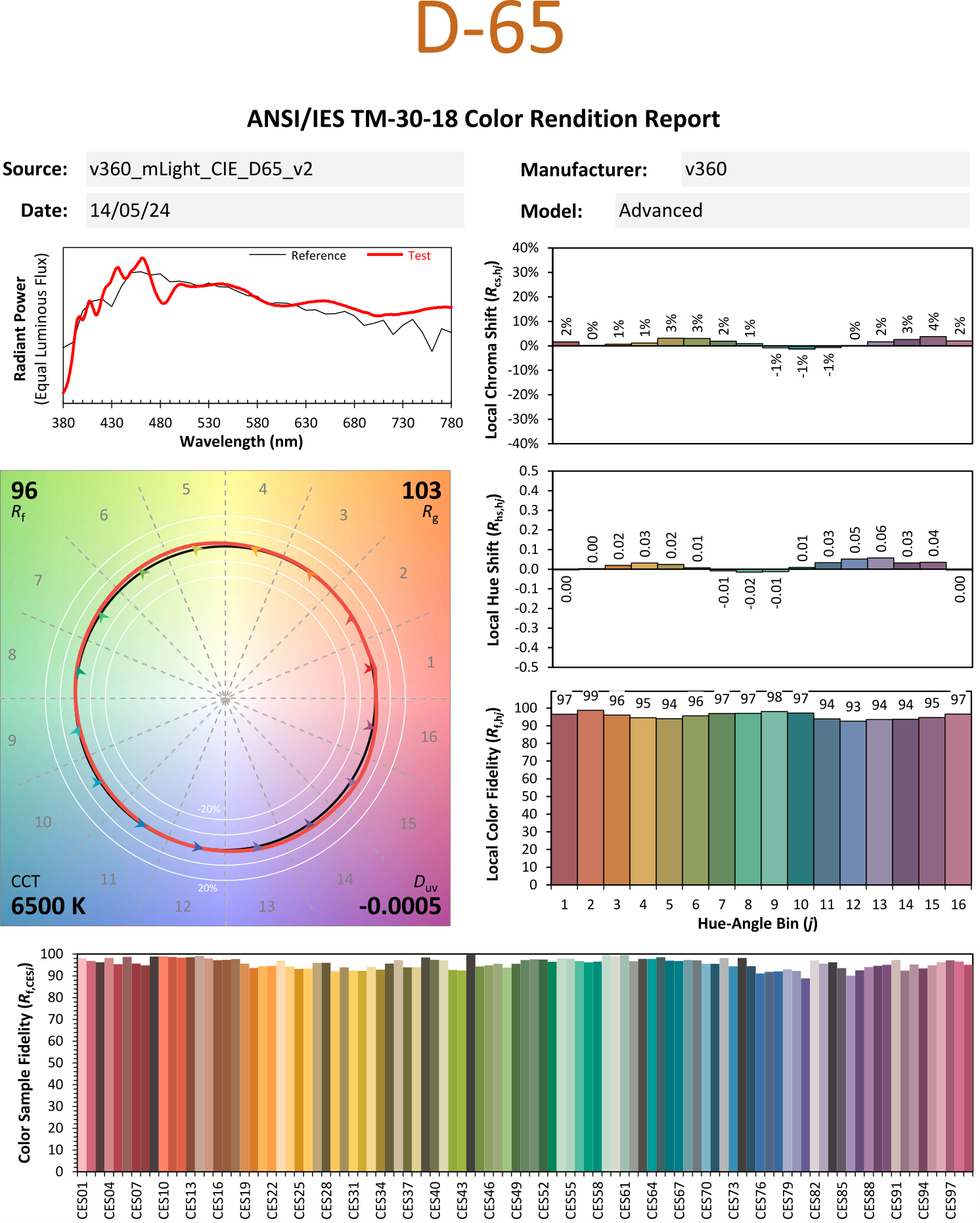 - D65 : 420 nm to 680 nm with 90% Sun Spectrum Matching + 365 nm